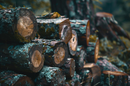 Stack of wooden logs in a forest, mossy timber and pile of trees, natural resource for fuel and building materials.