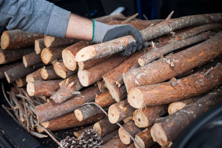 A man holds a trunk from a pile of pine branches and pine nuts for fuel in the trunk of the car