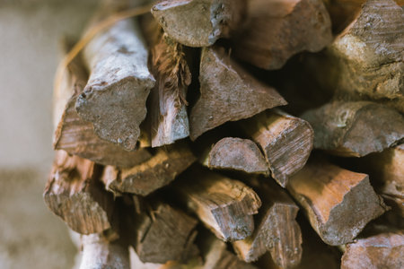 Firewood from chopped birch with bark and knots lies in a woodpile