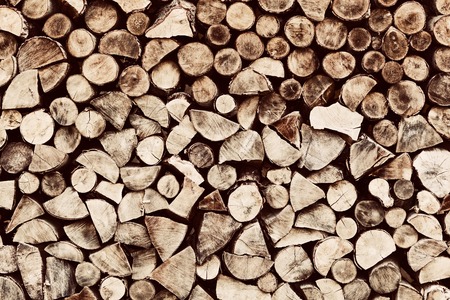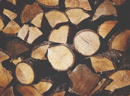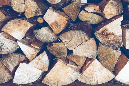 Background of wooden textured firewoods, toned. concept of warm atmosphere.