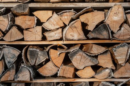 Background image of woodpile. Firewood is neatly stacked. Birch logs. Firewood for kindling a stove. Warehouse with firewood. A closeup. Background for text. Stock of firewood for the winter.