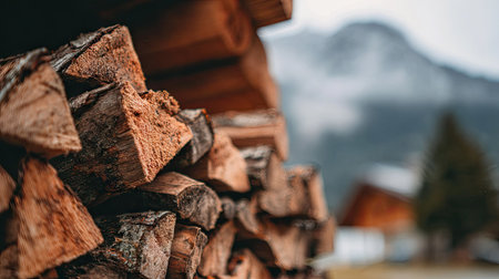 This image displays a neatly stacked pile of firewood in a close-up shot. The wood features a textured surface and various shades of brown and orange. The composition highlights the wooden texture with a blurred background suggesting a natural outdoor setting, possibly in a mountainous region. Suitable for various editorial and commercial applications.