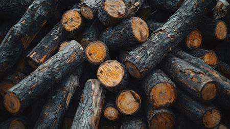 Overhead view of numerous freshly cut tree logs stacked in a pattern, showcasing the natural wood grain and cut marks of each log.. AI Generation