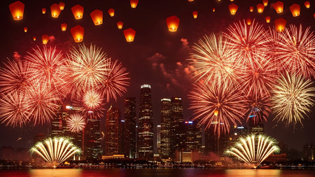 Vibrant fireworks illuminate a modern city skyline at night. Festive celebration.