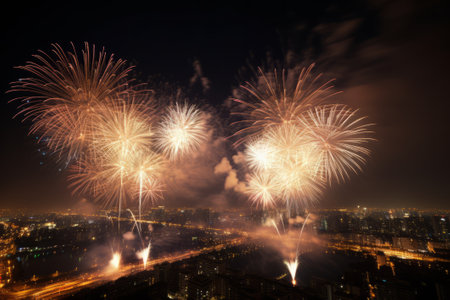 Spectacular cityscape fireworks display illuminating night sky celebration