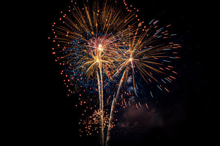 Colorful fireworks display on a dark sky background; Celebrations, Festivals, Independence Day, 4th of July or New Year