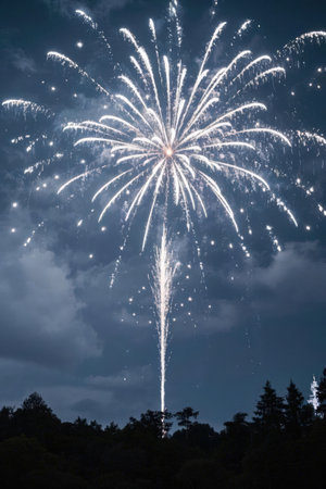 Bright fireworks burst into the night sky, filling the air with vibrant colors and excitement at a local celebration in the park. Families gather to enjoy the show.