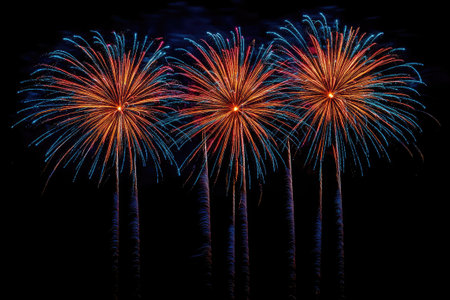 Three fireworks exploding in a dark night sky, creating a vibrant and celebratory display