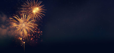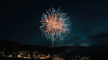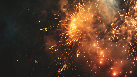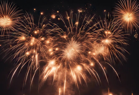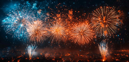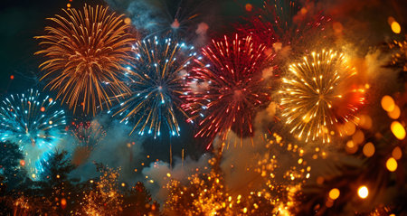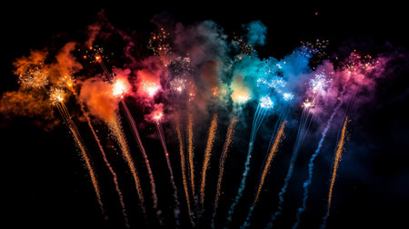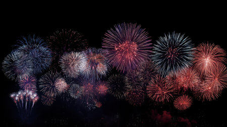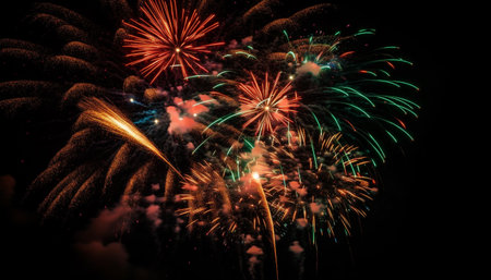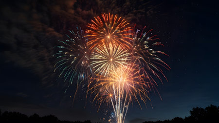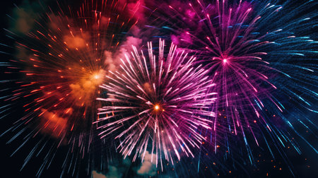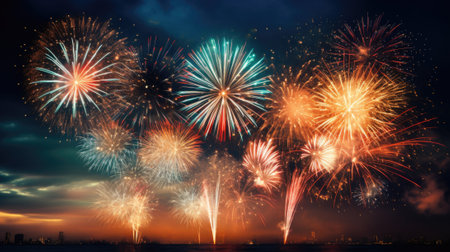 A vibrant display of fireworks lights up the night sky. Large bursts of light illuminate the dark canvas above, creating mesmerizing spectacle of color and movement. Generated AI. Festive background.