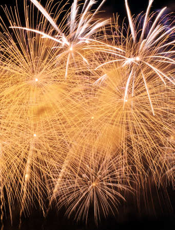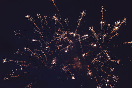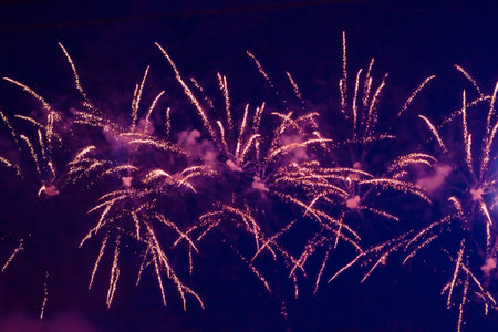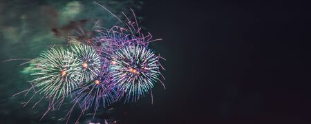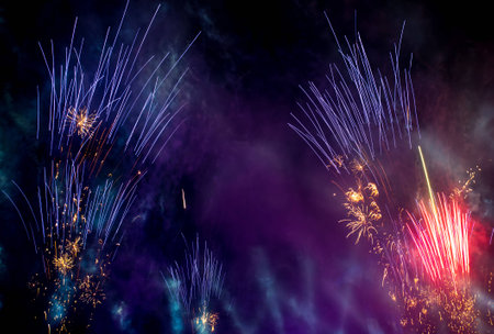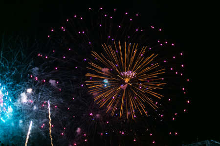 Colorful fireworks display on night sky background. Pyrotechnics show, sparks and glow