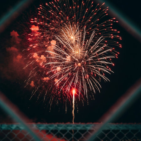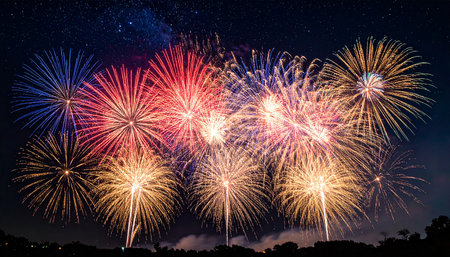 Vibrant colors illuminate exploding firework display on Fourth of July generated by artificial intelligence
