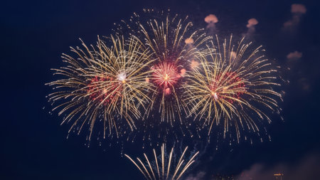 Shimmering fireworks explosion showing red, gold, and blue sparks isolated on black background, perfect for holiday celebration theme