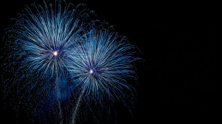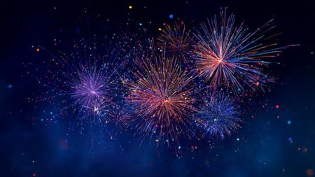 The image features vibrant fireworks bursting in a dark sky. Various colors such as red, blue, and yellow illuminate the night. The composition showcases an overhead perspective, with an emphasis on illumination and dynamic shapes, suitable for event promotions and visual storytelling. The scene evokes a sense of celebration and joy.