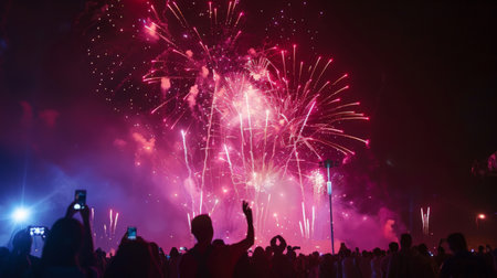 Fireworks explode in a dazzling display against the dark night sky illuminating the scene with vibrant magenta and gold bursts creating a festive and celebratory atmosphere perfect for holidays like