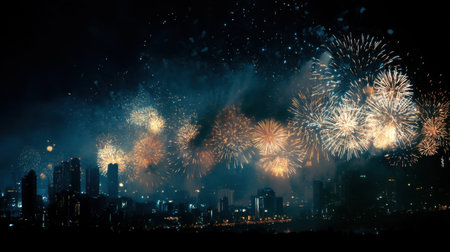 A stunning display of colorful fireworks lights up the night sky above a bustling city skyline, creating a magical atmosphere of celebration and joy during a festive event.
