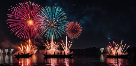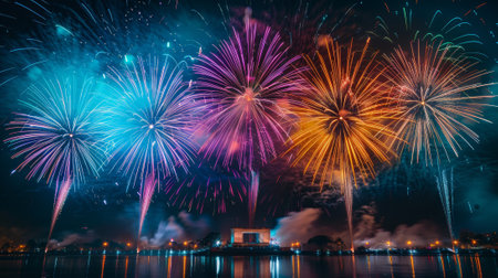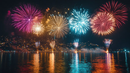 Breathtaking display of colorful fireworks over water at night, creating a stunning reflection. Perfect for celebrating events and festivities.