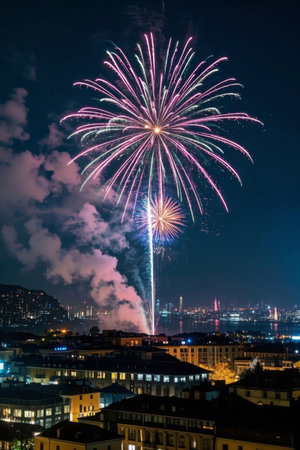 Colorful fireworks light up the night sky over the city, creating a festive vibe.