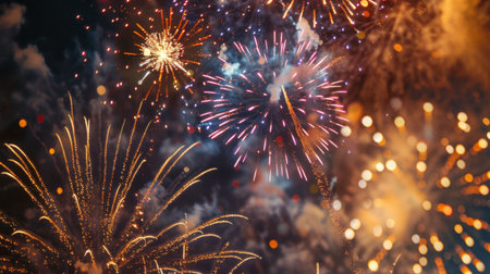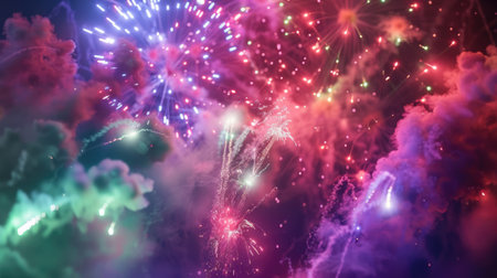 A vibrant fireworks display illuminates the dark night sky. The image showcases explosive bursts of light in various shapes and sizes. The composition features a dynamic arrangement of colors and textures, suggesting celebration and joy. This image could be used for various commercial or editorial purposes.
