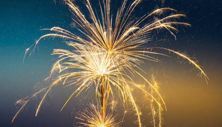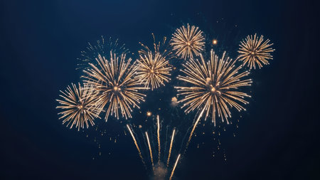 Bright golden and silver spherical fireworks on dark sky, illuminating surroundings and creating festive, celebratory ambiance