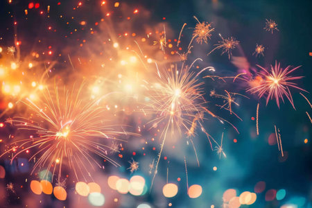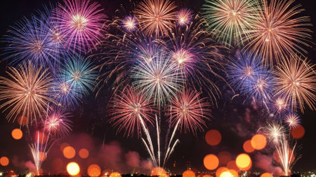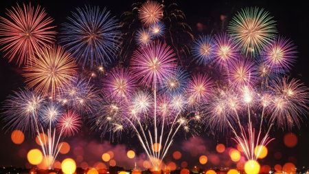 A vibrant fireworks display illuminates the night sky with bursts of color. The image showcases various firework shapes and hues, from reds and blues to yellows and greens. The composition features an overhead view with bokeh lights at the bottom, suggesting a nighttime celebratory event with potential use in various commercial contexts.