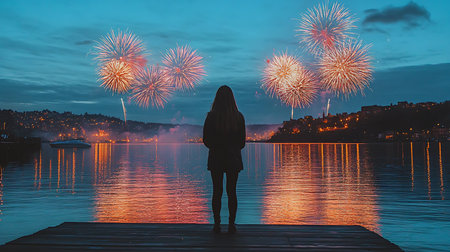 Generative AI Image of A Beautiful Woman Standing on a Wooden Plank by the Lake with Fireworks