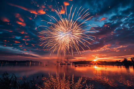 A breathtaking fireworks display illuminates the night sky, reflected beautifully on calm water, creating a stunning visual spectacle perfect for celebrations.