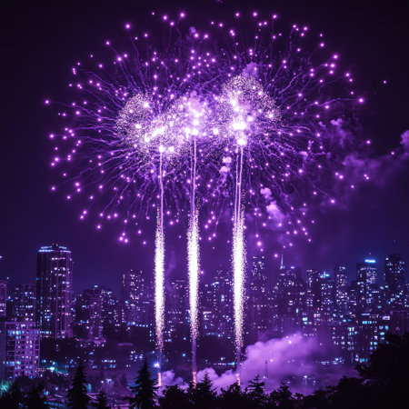 A stunning fireworks display illuminating the night sky over a city skyline, featuring vibrant colors and a captivating bokeh effect in the foreground.