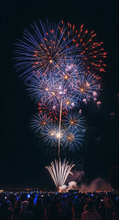A captivating firework display illuminating the night sky during a cultural celebration, with spectators gathered to witness the spectacle, symbolizing joy and communal spirit.