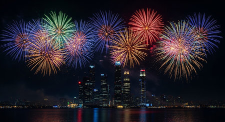Colorful fireworks light up the night sky over the city, creating a festive vibe.
