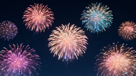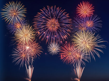 Spectacular display of multicolored fireworks lighting up a clear night sky, creating a festive atmosphere
