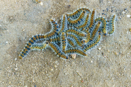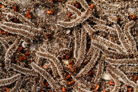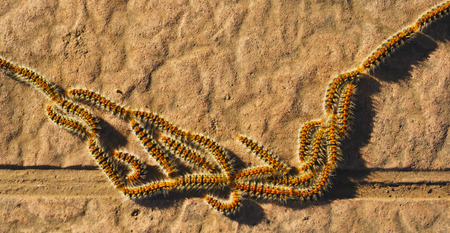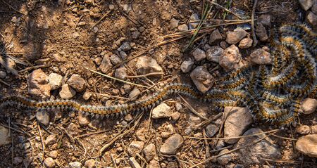 Row of processionary caterpillar walking on the ground