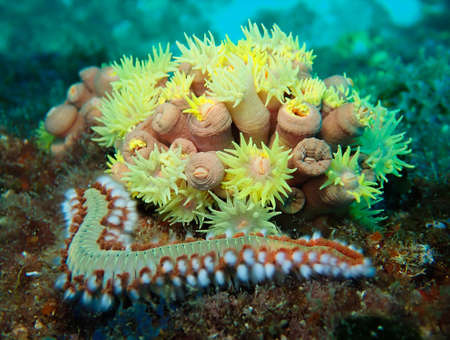 Big fire worm moving past a colony of bright yellow anemones