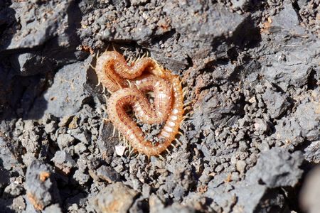 A yellow Geophilomorph on a black soil background.