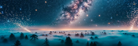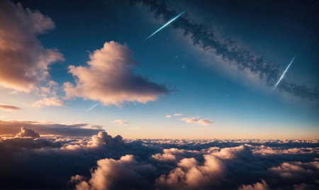 against the background of the starry sky. shooting stars fly between the clouds and outer space, connecting the mundane and the galaxy. nebula and defocusing of the composition. the hazy galaxy effect