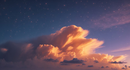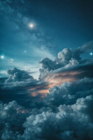 Majestic storm clouds illuminated by lightning create dramatic night sky filled with stars. scene captures beauty and power of nature, evoking sense of awe and wonder