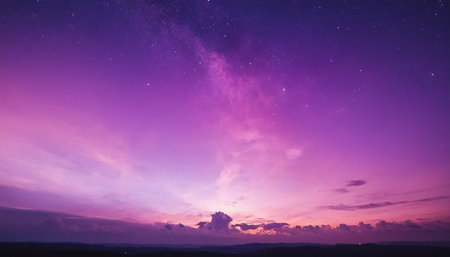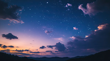 Captivating view of a starry sky at dusk, showcasing colorful clouds over a serene mountain landscape. Perfect for nature-themed projects or backgrounds.