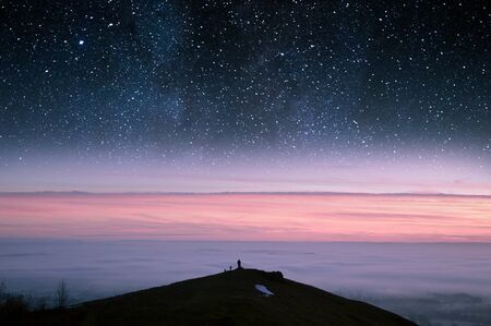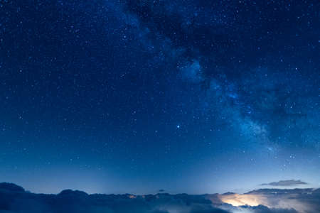 Starry blue sky above a sea of clouds at night. Night photography of long exposure landscapes with the Milky Way and the immensity of the universe.