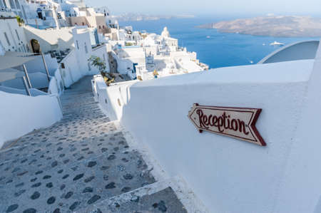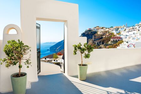 White architecture on Santorini island, Greece. Beautiful landscape with sea view.