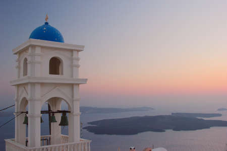 Coastal view of the church bell tower and white buildings in Imerovigli on Santorini island in Greece