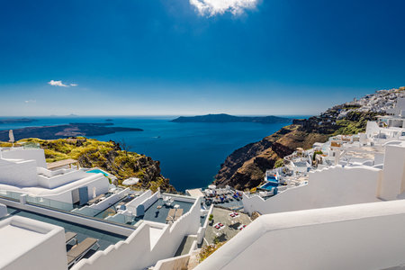 White architecture on Santorini island, Greece. Beautiful summer landscape, sea view. Amazing vacation and holiday conceptual scenery, famous and luxury travel, tourism background