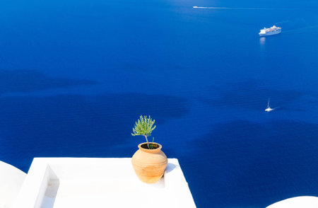 Terrace with large flower pots on the sea view, Santorini, Greece