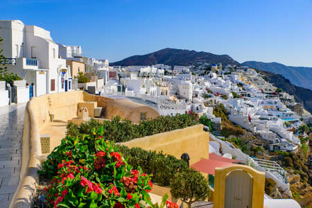 Santorini island, Greece. Oia, Fira town. Traditional and famous houses and churches over the Caldera, Aegean sea