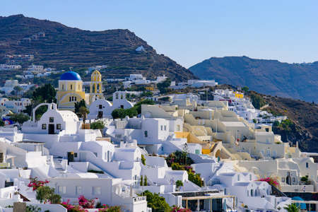 Oia town on Santorini island, Greece. View of traditional white houses and churches with blue domes over the Caldera, Aegean sea