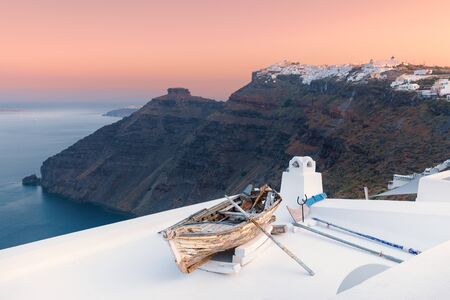 Old wooden boat in Firostefani village at romantic sunrise, Santorini island Greece.