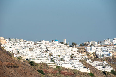 Oia city on Santorini island on a clear sunny day. Cliff overlooking the sea and the caldera.