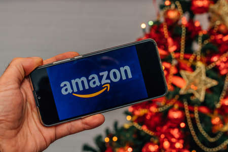 Galicia, Spain - November 24, 2021: mobile phone screen with amazon logo at christmas
