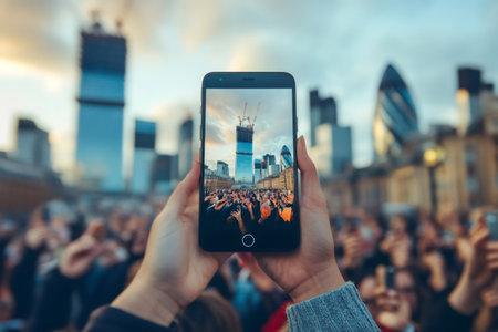 Woman uses mobile phone to capture image of cityscape with crowd in foreground
