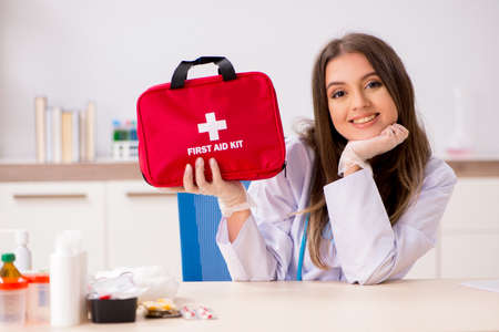Hotel porter employee presenting a first aid kit used for medical emergencies, advertising healthcare and medicine. Bellboy staff works in hospitality industry, fully equipped. Camera B.