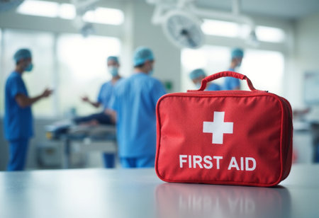 First aid kit on table against surgeons and nurses in operating room at hospital