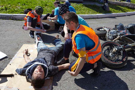 St. Petersburg, Russia - May 12, 2018: contest / exercises on first aid at the pre-hospital stage. Three young people in the role of road workers assist the motorcyclist.